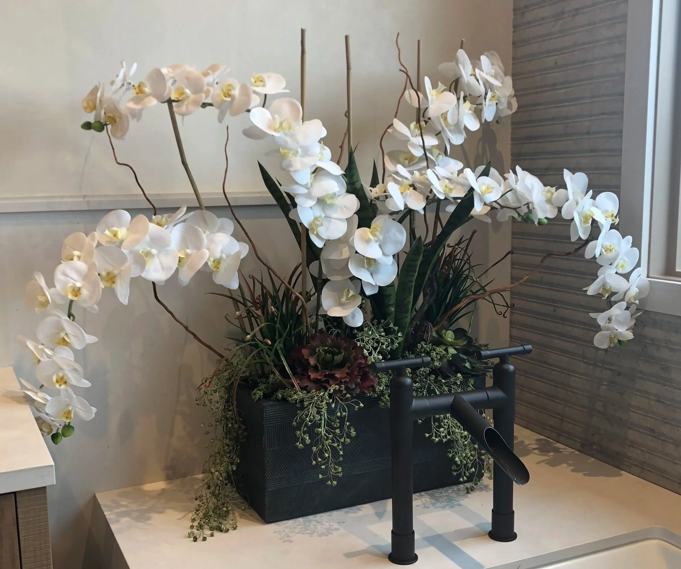 Elegant white orchid floral arrangement in a black rectangular planter on a white countertop, with a black faucet in the foreground and a modern, textured gray wall in the background.